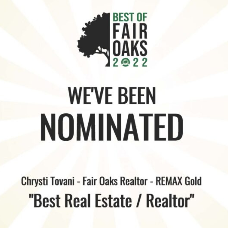 I’m nominated in the Best Realtor of Fair Oaks category. I don’t expect to win, but I sure would love to stay in the top 5 or 6. Whenever I drive down our roads, I imagine my signs posted along the streets, just like well-known agents I’ve seen. I want to be known as your local Fair Oaks Realtor! If you’re reading this, it’s happening! I am so excited! Thank you for being here!